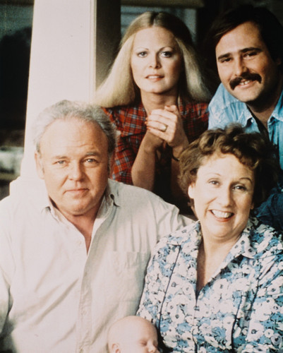 This image is from All in the Family and features Carroll O'Connor as Archie Bunker, Jean Stapleton as Edith Bunker, Rob Reiner as Michael 'Meathead' Stivic and Sally Struthers as Gloria Bunker Stivic available in multiple sizes. Your satisfaction guaranteed.