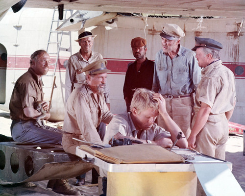 This image is from The Flight of the Phoenix and features James Stewart as Capt. Frank Towns, George Kennedy as Mike Bellamy, Richard Attenborough as Lew Moran, Peter Finch as Capt. Harris, Hardy Krüger as Heinrich Dorfmann, Ernest Borgnine as Trucker Cobb, Ian Bannen as 'Ratbags' Crow and Ronald Fraser as Sgt. Watson available in multiple sizes. Your satisfaction guaranteed.