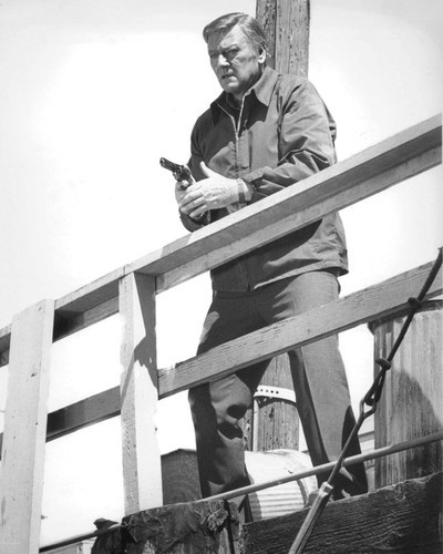 JOHN WAYNE MCQ WITH GUN ON BOAT DOCK PRINTS AND POSTERS 190794