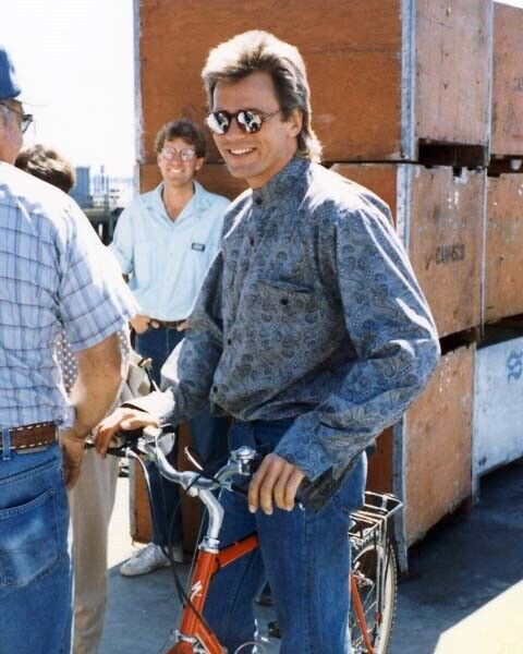 Richard Dean Anderson on bicycle chats with crew MacGyver 8x10 inch photo