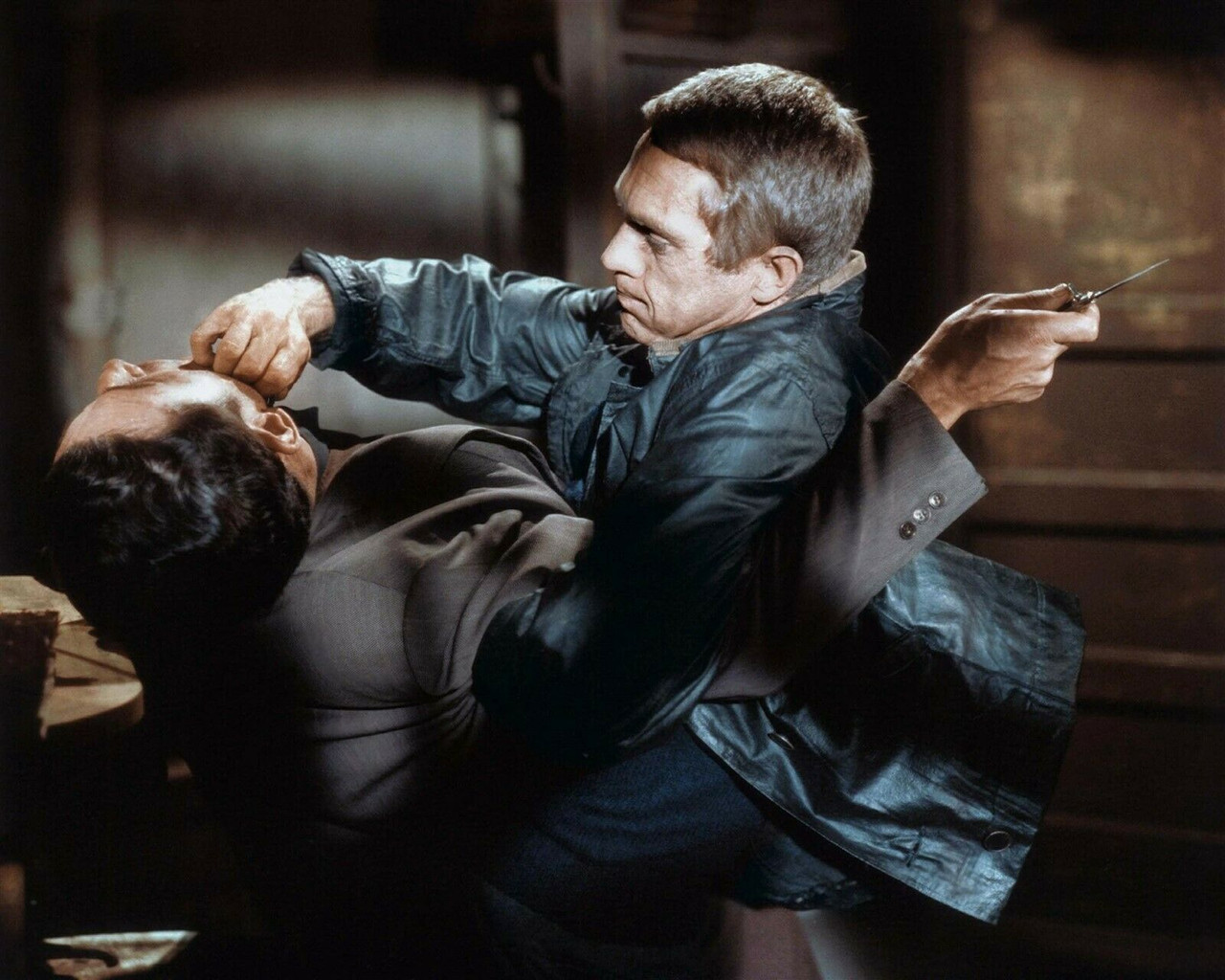 The Cincinnati Kid Steve McQueen holds razor blade to Ron Soble face 8x10 photo